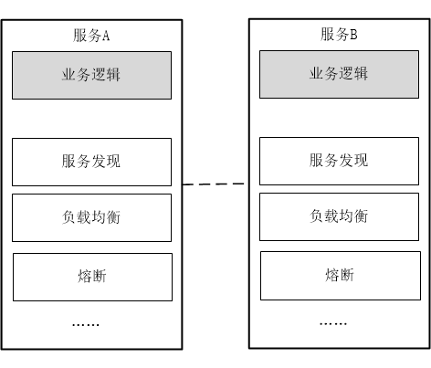 在微服务架构中,服务发现、熔断、治理等能力是微服务架构重要的组成部分。微服务化之后,服务更加的分散,复杂度变得更高,起初开发者将诸如熔断、超时等功能和业务代码封装在一起,使服务具备了网络控制能力,如下图所示: