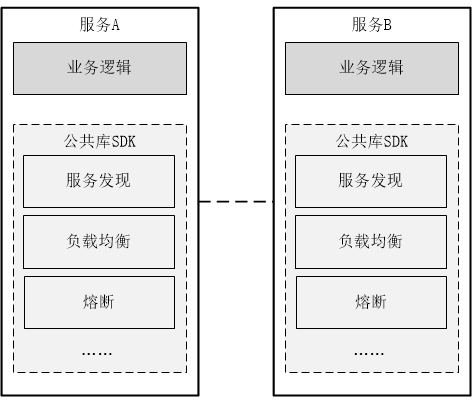 ● 基础设施功能(如,服务发现,负载均衡、熔断等)和业务逻辑高度耦合。
